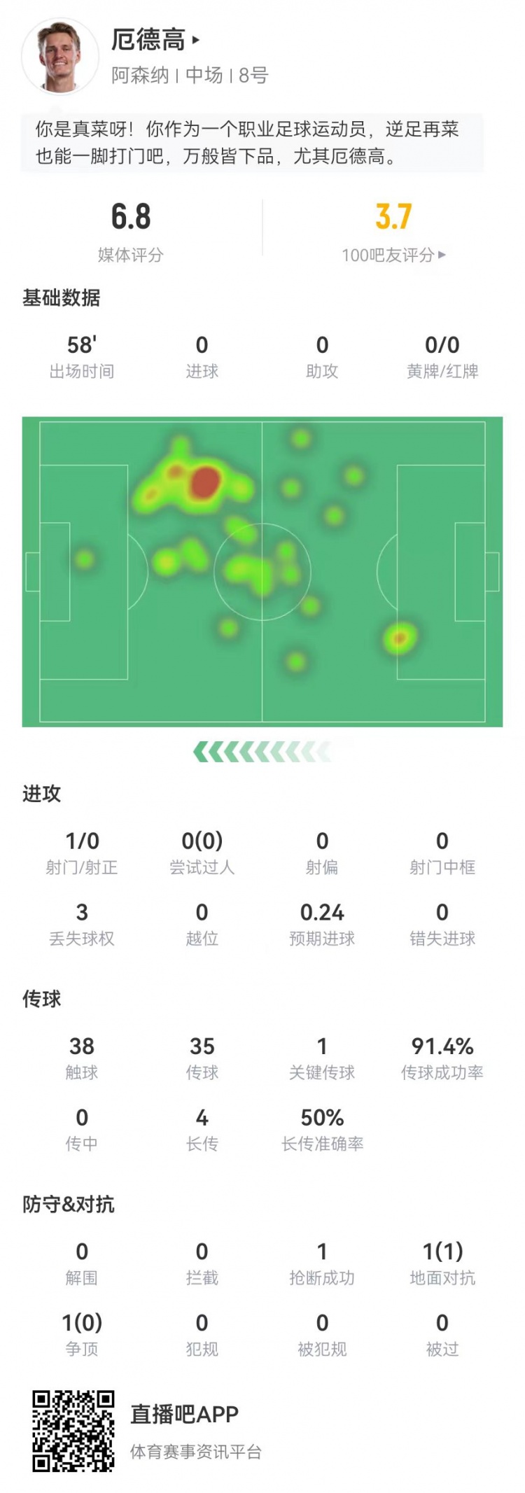 厄德高本场1射0正+1关键传球 4长传2成功+2对抗1成功 获评6.8分